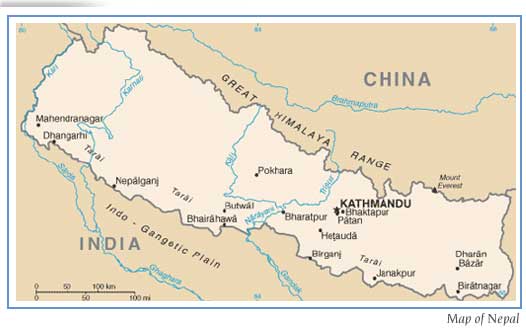 Sandwiched between two Asian giants - China and India - Nepal traditionally has been characterized as "a yam caught between two rocks." Noted for its majestic Himalayas, which in Sanskrit means the abode of snow, Nepal is very mountainous and hilly. Its shape is roughly rectangular, about 650 kilometers long and about 200 kilometers wide, and comprises a total of 147,181 square kilometers of land. It is slightly larger than Bangladesh or the state of Arkansas . Nepal is a landlocked country, surrounded by India on three sides and by China 's Xizang Autonomous Region ( Tibet ) to the north. It is separated from Bangladesh by an approximately fifteenkilometer -wide strip of India 's state of West Bengal, and from Bhutan by the eighty-eight-kilometer-wide Sikkim , also an Indian state. Such a confined geographical position is hardly enviable. Nepal is almost totally dependent on India for transit facilities and access to the sea--that is, the Bay of Bengal--even for most of the goods coming from China .