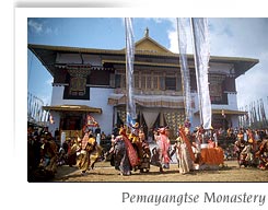 Situated at 2378 meters on the hill high above Gyalshing is Sikkim 's premier Nyingmapa monastery, Pemayangtse, whose monks above others enjoy the privilege of performing all royal ceremonies. Inside the monastery is the fabulous Santhokpalri, which is said to have been revealed in a dream to Dungzin Rimpoche and was carved by him single-handedly. Built as a small temple by Lhatsun Chempo in the late 17th Century, it was only three generations later that it was reconstructed into its current size by the Lama Jigme Pawo in the reign of the third Chogyal Chador Namgyal. Its main chaam (masked dance) is held two days prior to Losar (Tibetan New Year).